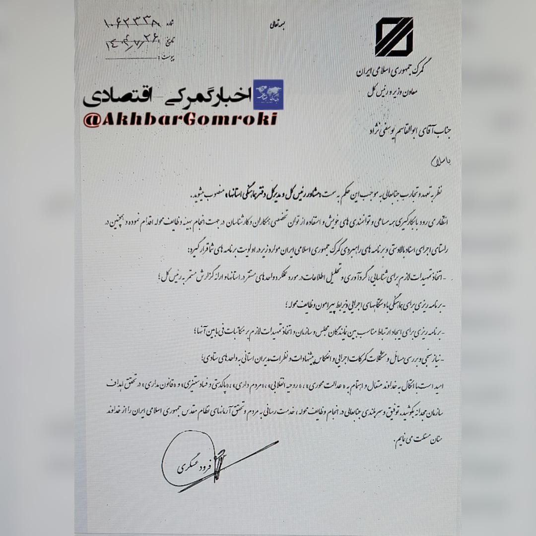 همچنین در حکم دیگری از سوی رئیس کل گمرک ایران، قربان کریمی به سمت سرپرستی دفتر بازرسی و مدیریت عملکرد گمرک منصوب شد. کریمی پیش از این ناظر گمرکات استان سیستان و بلوچستان بود. همچنین فرود عسگری معاون وزیر اقتصاد و رئیس کل گمرک ایران در حکمی ابوالقاسم یوسفی نژاد را به سمت مشاور رئیس کل و مدیر کل دفتر هماهنگی استان ها منصوب کرد. یوسفی نژاد، مدیر کل گمرکات اجرایی و عضویت در کمیسیون رسیدگی به اختلافات گمرکی را در کارنامه کاری خود دارد.