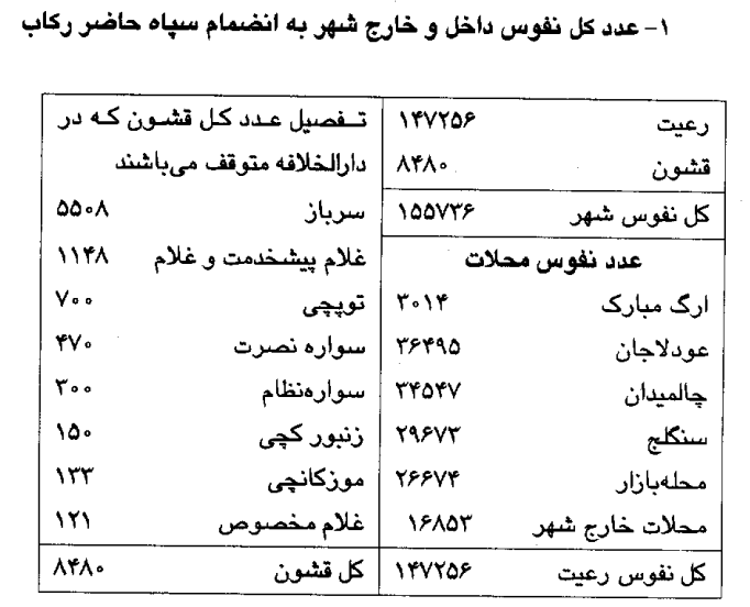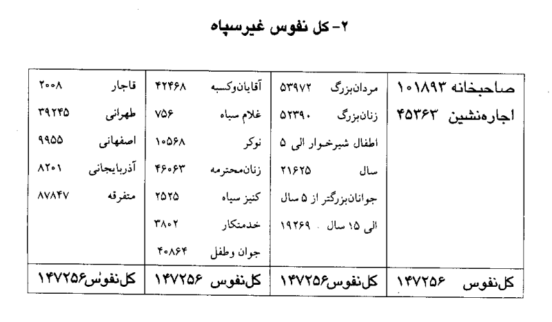 بر اساس اين سرشماري٬ جمعيت تهران در سال 1246 شمسي٬ 155 هزار و 736 نفر بود. از این تعداد 147 هزار و 256 نفر را افراد غیرنظامی و 8480 نفر را افراد نظامی تشکیل میدادند.