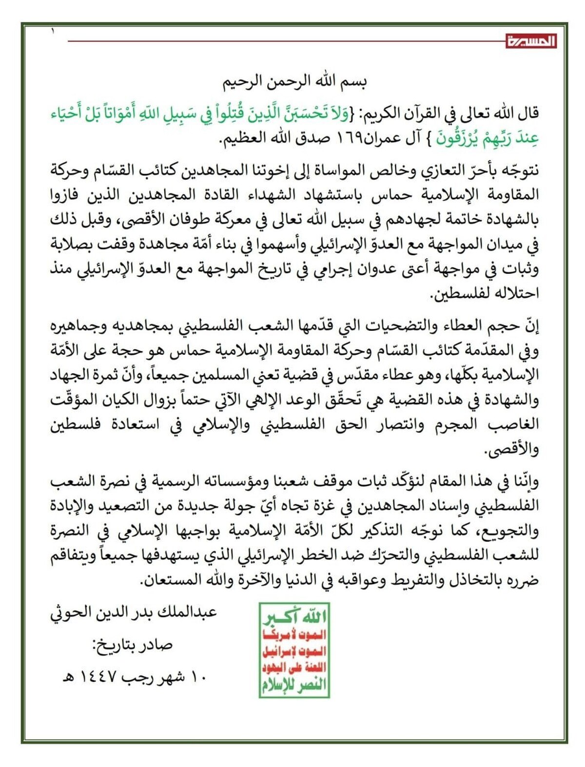 رهبر انصارالله یمن به مناسبت شهادت جمعی از فرماندهان گردانهای القسام، در پیام تسلیت خود به مقاومت فلسطین...