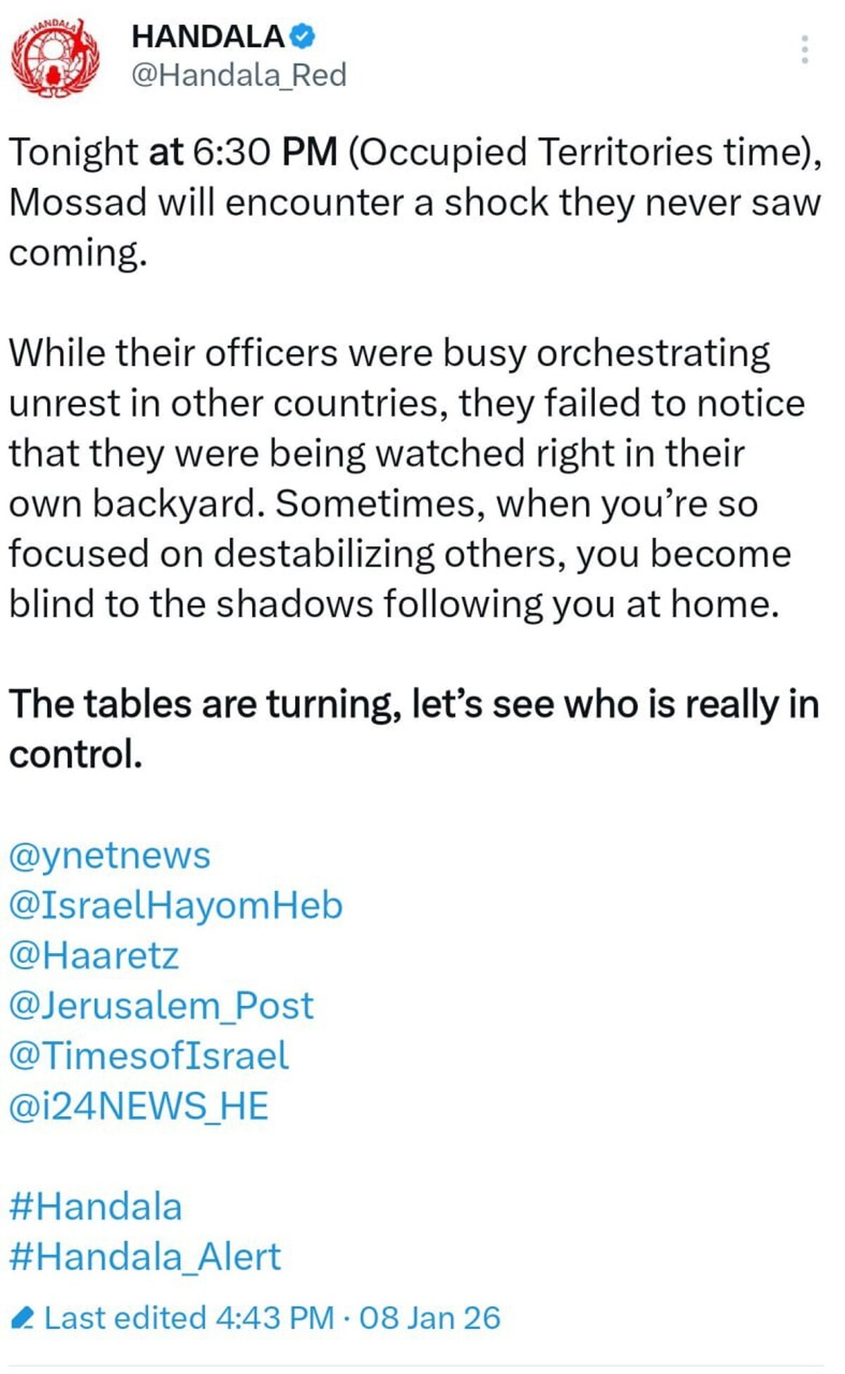 حنظله، تحلیلگر سیاسی، با انتشار توییتی از وقوع یک شوک برای موساد در ساعت ۶:۳۰ عصر بهوقت سرزمینهای اشغالی خبر داد.