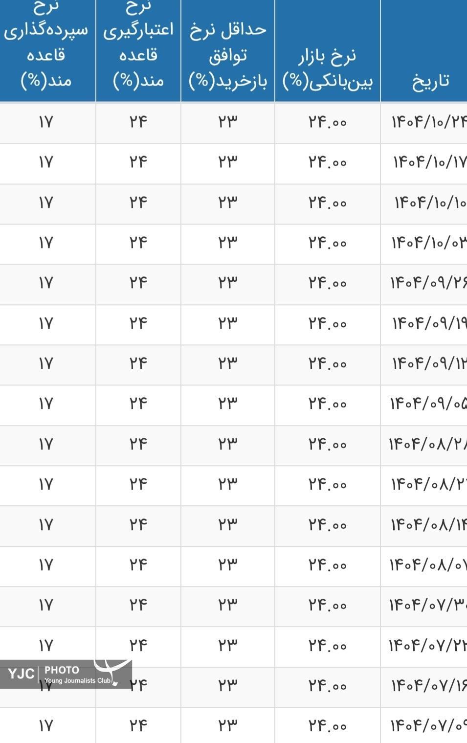 به گزارش بولتن نیوز به نقل از باشگاه خبرنگاران جوان، طبق آمار بانک مرکزی، میانگین وزنی نرخ بهره بین بانکی در هفته‌ای که گذشت نسبت به هفته قبل‌تر (۱۷ دی ماه) بدون تغییر برای شانزدهمین هفته متوالی در سطح ۲۴ درصد ثابت ماند.