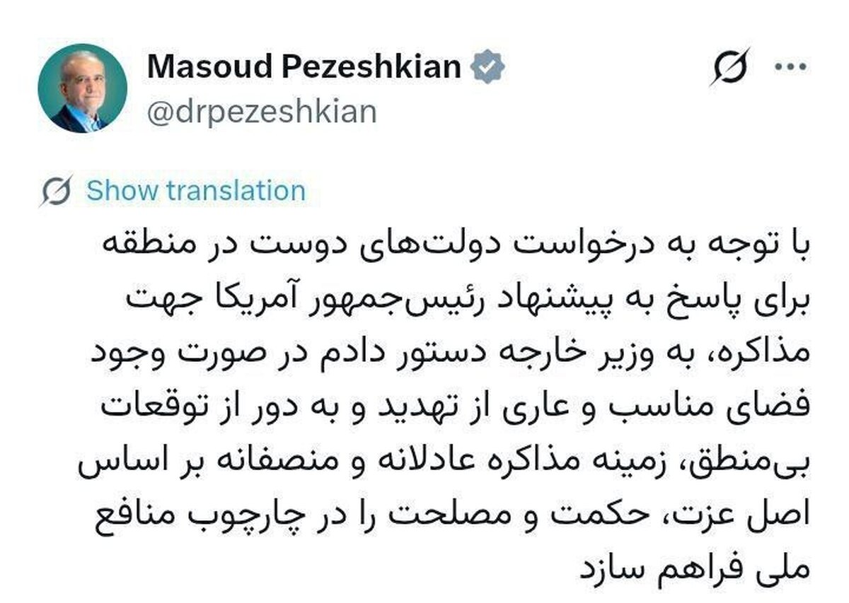 به گزارش بولتن نیوز به نقل از ایسنا، رئیس جمهور در ایکس: با توجه به درخواست دولتهای دوست در منطقه برای پاسخ به پیشنهاد رئیسجمهور آمریکا جهت مذاکره، به وزیر خارجه دستور دادم در صورت وجود فضای مناسب و عاری از تهدید و به دور از توقعات بیمنطق، زمینه مذاکره عادلانه و منصفانه بر اساس اصل عزت، حکمت و مصلحت را در چارچوب منافع ملی فراهم سازد.