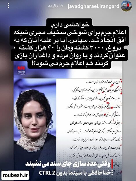 گروه فرهنگی: جواد قارایی، مستندساز شناختهشده، در واکنش به ادعای کذب یک بازیگر دربارهی تعداد کشتههای کشور، نوشت: «خواهشی دارم. اعلام جرم برای شوخی سخيف مجرى شبكه افق انجام شد. سپاس. آیا بر علیه آنان که به دروغ ۳۰۰۰ کشته وطن را ۴۰ هزار کشته عنوان کردند و با روان مردم و داغداران بازی کردند هم اعلام جرم میشود؟»