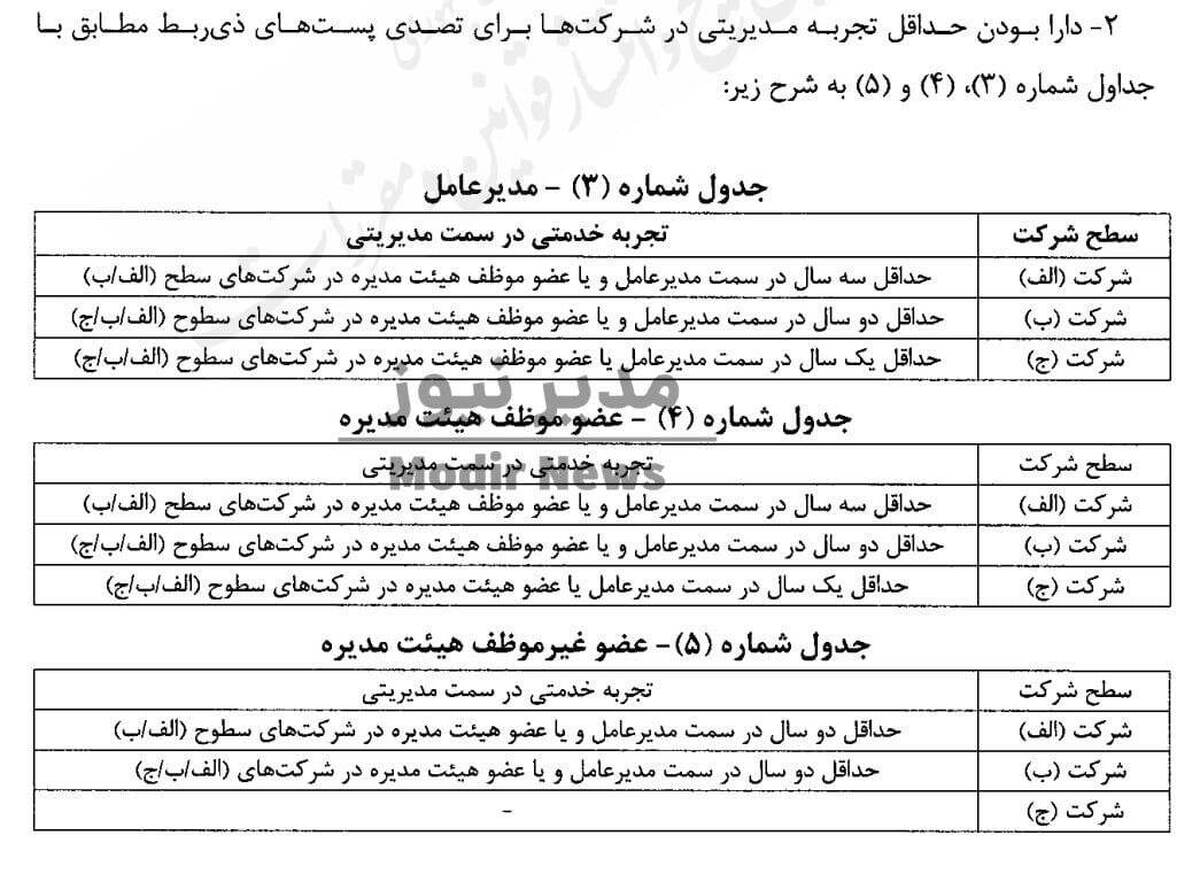تنها یک بخش از این مصوبه شرایط بسیار خاصی را برای اعضای هیات مدیره شرکتهای تابعه و وابسته در نظر گرفته است. بهگونهای که این شرکتها در ۳ سطح «الف»، «ب» و «ج» تقسیم بندی شدهاند. به عنوان مثال یک عضو غیرموظف در هیات مدیره شرکت سطح «الف»، بایستی حداقل دو سال در سمت مدیرعامل یا عضو هیات مدیره در شرکتهای سطح «الف» و «ب» را سابقه داشته باشد.