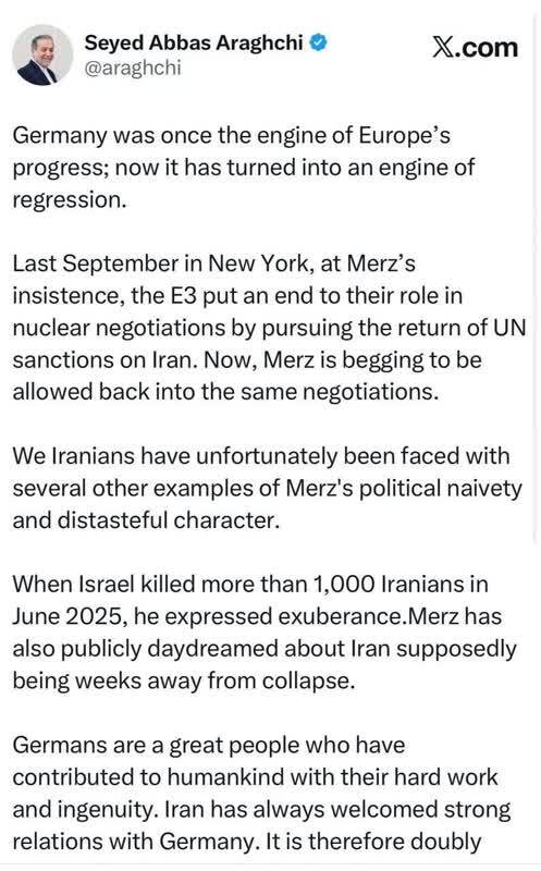 واکنش عراقچی به اظهارنظرات و مواضع سینوسی و ناپخته صدراعظم آلمان