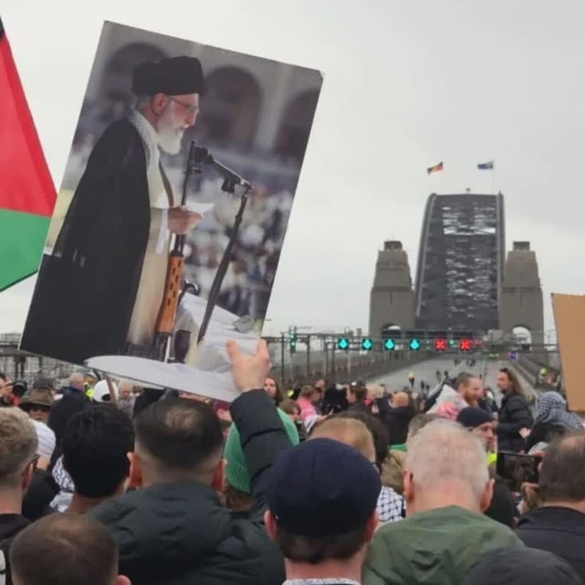 عکس مقام معظم رهبری و آیتالله العظمی سیستانی و شهدای حمله اسرائیل به ایران در راهپیمایی عظیم مردم سیدنی