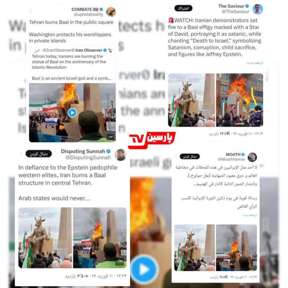 فعال رسانهای مشهور و کاربر انگلیسی "The Saviour": تماشا کنید: تظاهرکنندگان ایرانی، مجسمه بعل را که با ستاره داوود مشخص شده بود، به آتش کشیدند و آن را شیطانی جلوه دادند، در حالی که شعار «مرگ بر اسرائیل» سر میدادند؛ نماد شیطانپرستی، فساد، قربانی کردن کودکان و چهرههایی مانند جفری اپستین است.