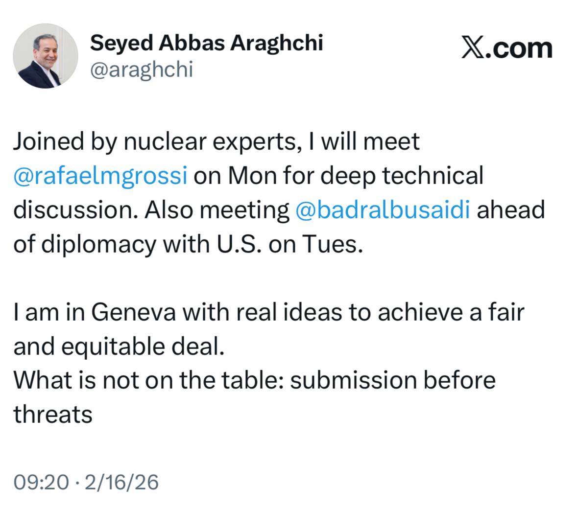 به گزارش بولتن نیوز به نقل از ایسنا، وزیر امور خارجه:امروز همراه با متخصصین هسته‌ای کشورمان با رافائل گروسی (مدیرکل آژانس بین‌المللی انرژی اتمی) برای مباحث دقیق فنی دیدار خواهم کرد. همچنین پیش از آغاز رایزنی‌های دیپلماتیک با ایالات متحده در روز سه‌شنبه، با بدر البوسعیدی (وزیر امور خارجه عمان) ملاقات می‌کنم.