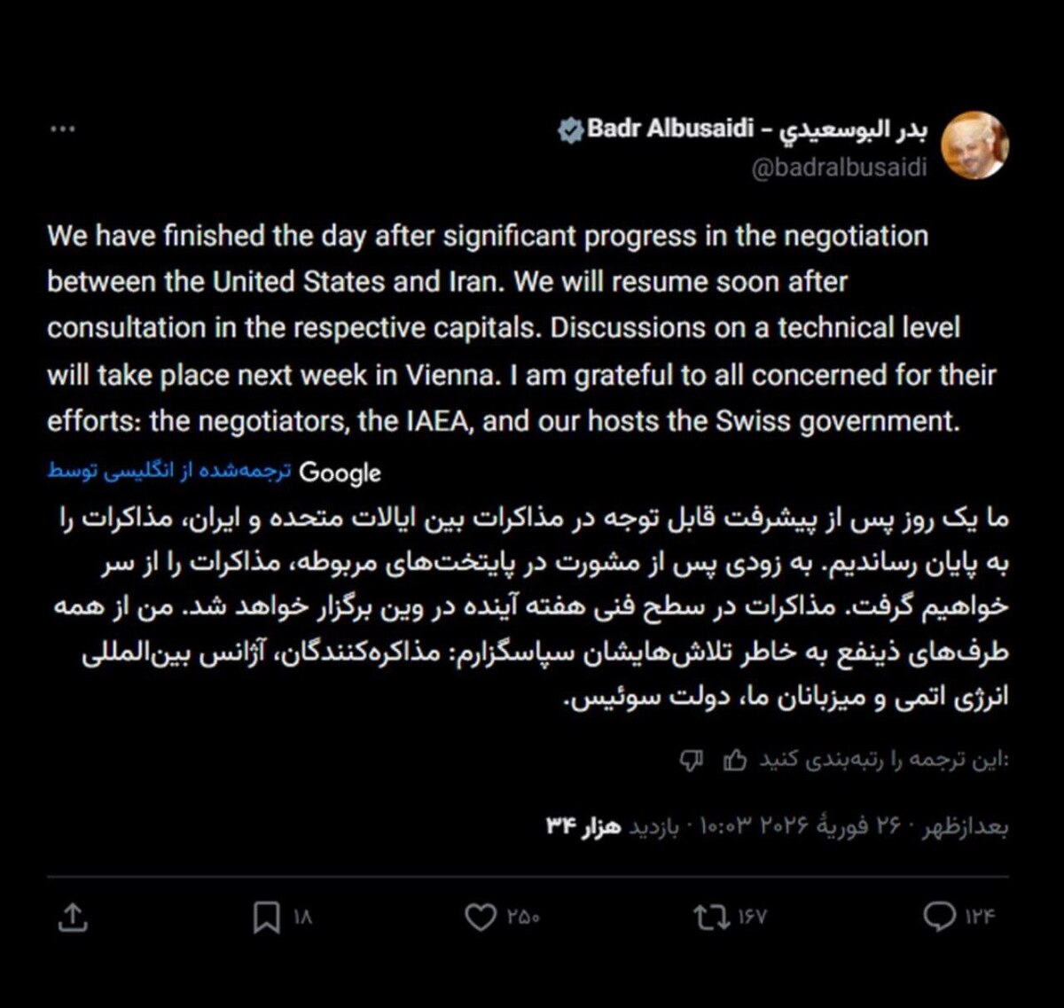 🔹 من از همه طرفهای ذینفع به خاطر تلاشهایشان سپاسگزارم: مذاکرهکنندگان، آژانس بینالمللی انرژی اتمی و میزبانان ما، دولت سوئیس.